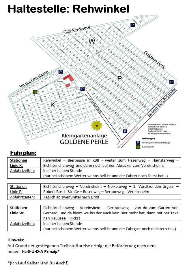 Hintergrund-Infos: Den eigentlichen Ausschlag dafür, hier eine Bank aufzustellen, lieferte mir ein sehr alter Herr, der regelmäßig den steilen Weg hinauf lief, und alle paar Meter eine Pause einlegte und sich an den Gartenzäunen festhalten musste. Ich weiß nicht wer er war oder wo er hin wollte, aber ich sah ihn etliche Male, wenn ich in meinem Garten arbeitete. Die Gartenanlage ist eigentlich auch als Erholungsgebiet gedacht, und grade für ältere und gehbehinderte Menschen sind die langen Wege oft eine Herausforderung. Und warum die Haltestelle? In einem Fernsehbericht über ein Seniorenheim für Demenz-Patienten wurde berichtet, das immer wieder verwirrte Patienten versuchen, aus der abseits gelegenen Klinik nach Hause zu flüchten. So hat man vor der Klinik eine fiktive Bushaltestelle errichtet, die sogar über einen ausgedachten Fahrplan mit bekannten Orte verfügt. Meistens fand man die vermisste Patienten wartend an dieser Haltestelle auf, wo sie auf den nächsten Bus "nach Hause" warteten... Was mich freut: Nun sehe ich des öfteren ältere Leute auf dieser Bank sitzen, die eine kleine Pause einlegen, und ich sehe junge Menschen, die Selfies vor der Bushaltestelle und dem Fahrplan von sich machen weil sie das toll finden, und ich sehe Kinder, die dort mit ihren Rollern oder Spielzeugautos Busfahrer spielen. Das zeigt mit, das es eine gute Idee war... und ich hoffe nach wie vor, das sich noch weitere Kleingärtner melden, die auch eine solche Haltestelle bauen möchten. |